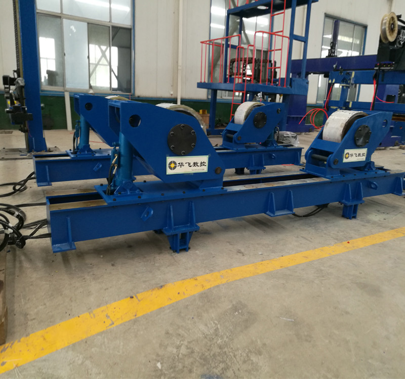 滚轮架上的液压缸带动滚轮座进行位置移动来调节筒体的中心高低、左右位置来使两筒体对齐。对齐后对两节筒体接缝处进行定位点焊。